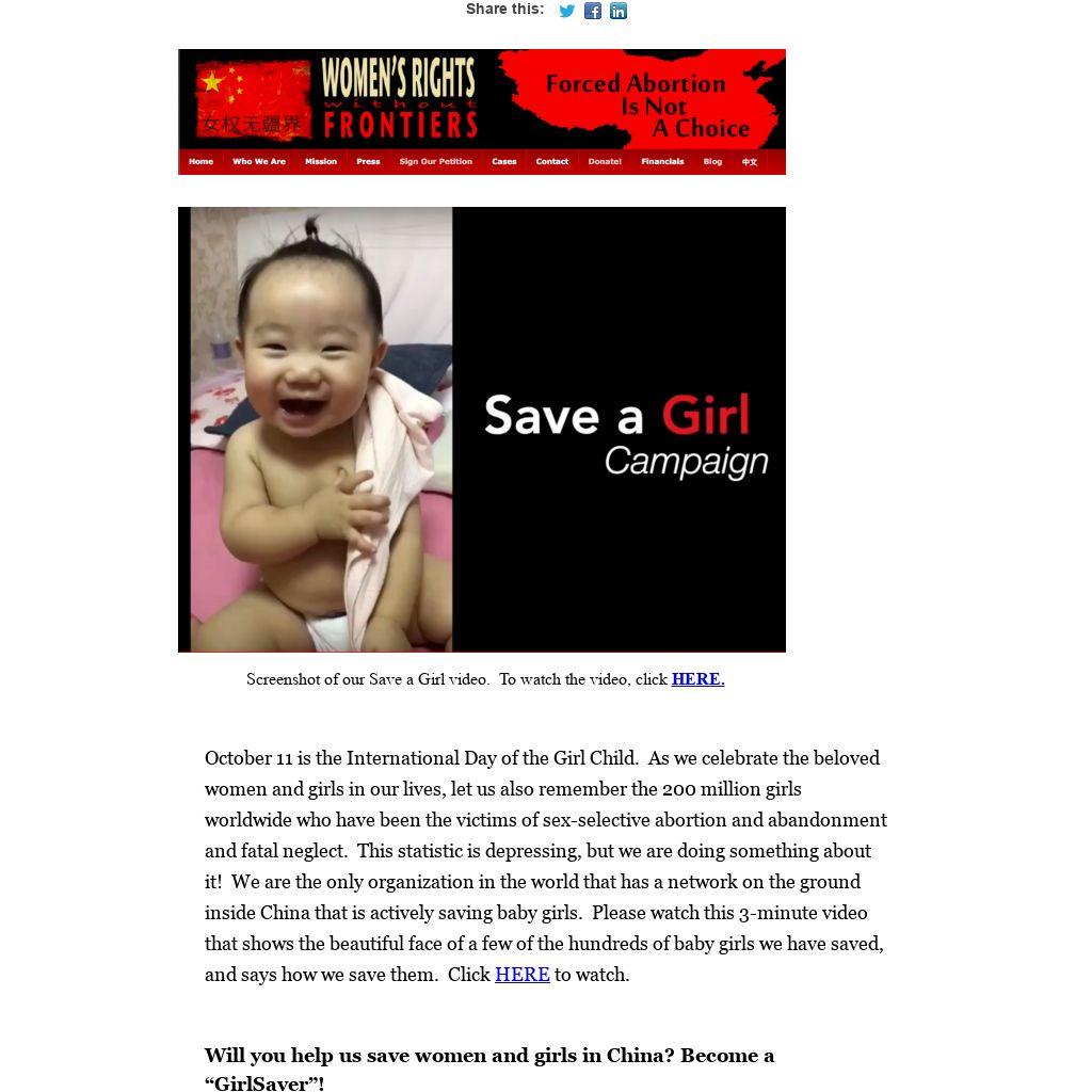In honor of the International Day of the Girl Child, won’t you help us save more girls like the ones in this video? So far, we have saved more than 200 girls, and yet there are millions more who are being aborted and abandoned just because they are girls. Or, they could have been born into grinding poverty. Each one of these girls is infinitely precious. Please help us save them by donating to our “Save a Girl” Campaign.