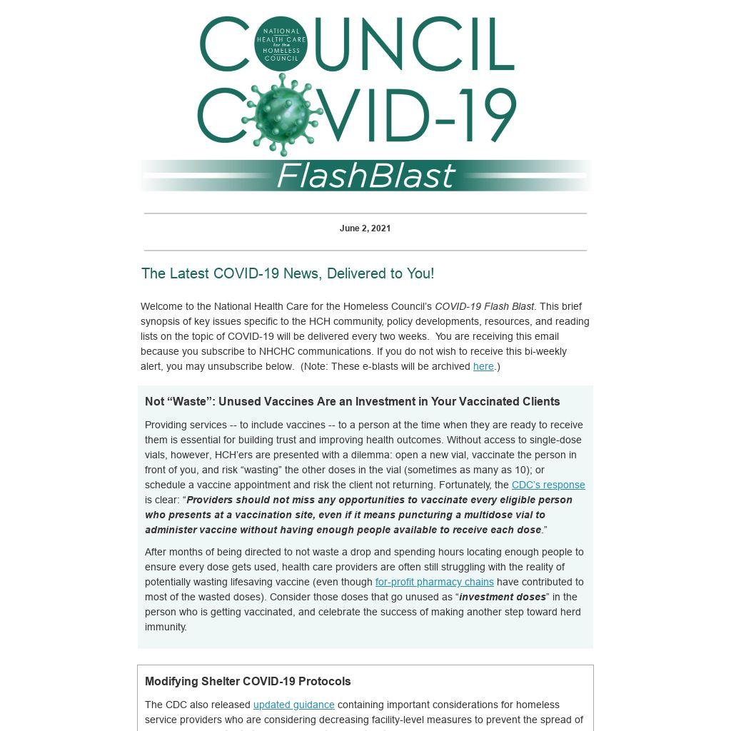 Welcome to the National Health Care for the Homeless Council’s COVID-19 Flash Blast. This brief synopsis of key issues specific to the HCH community, policy developments, resources, and reading lists on the topic of COVID-19 will be delivered every two weeks. You are receiving this email because you subscribe to NHCHC communications. If you do not wish to receive this bi-weekly alert, you may unsubscribe below. (Note: These e-blasts will be archived here.)