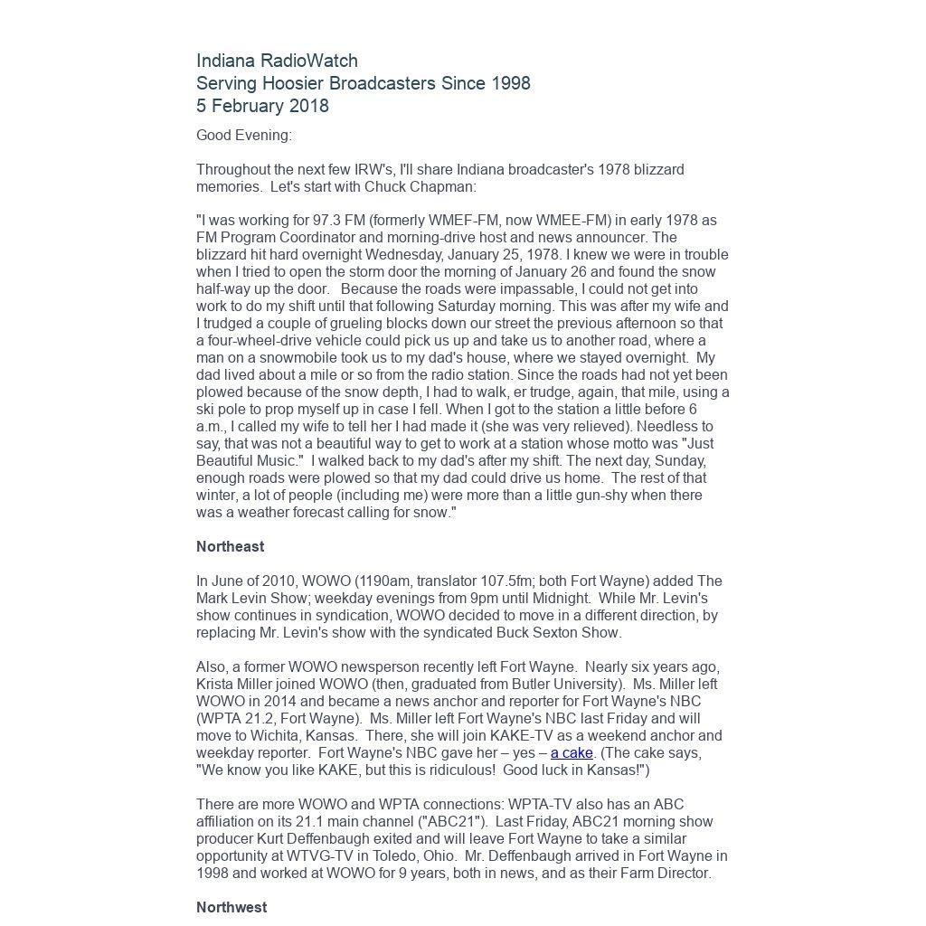 Throughout the next few IRW's, I'll share Indiana broadcaster's 1978 blizzard memories. Let's start with Chuck Chapman: