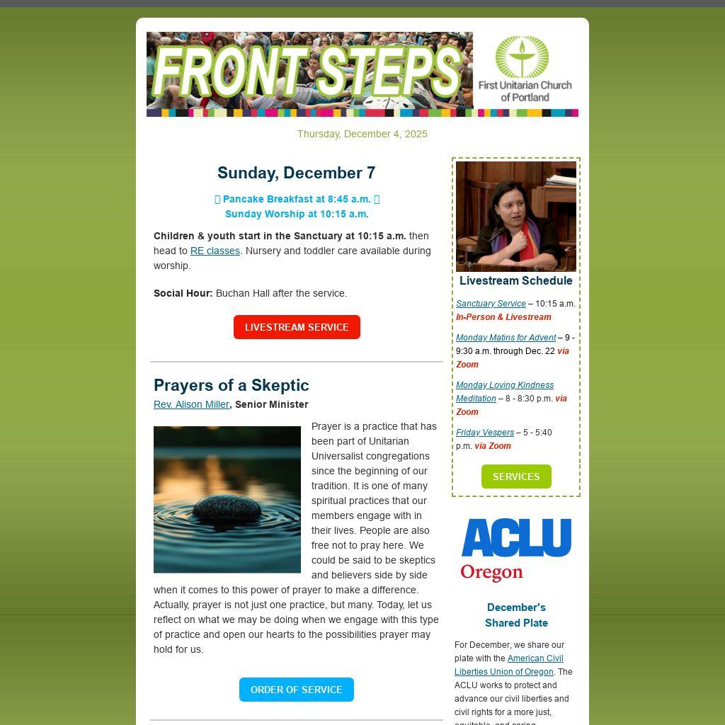 For December, we share our plate with the American Civil Liberties Union of Oregon. The ACLU works to protect and advance our civil liberties and civil rights for a more just, equitable, and caring democracy in Oregon. They build political power in meaningful partnership with impacted individuals and communities to disrupt and defend against oppressive systems. They educate and dispel misinformation, advocate at all levels of government, and fight in courts to protect and advance our democracy, civil liberties and civil rights. Most recently, First Unitarian has partnered with the ACLU of Oregon to promote and collect signatures for the Equal Rights for All 2026 ballot initiative, and in educating our congregation on immigration law and policies in Oregon. We, along with the ACLU, are members of the Oregon for All Coalition, working to defend immigrant rights throughout our state.