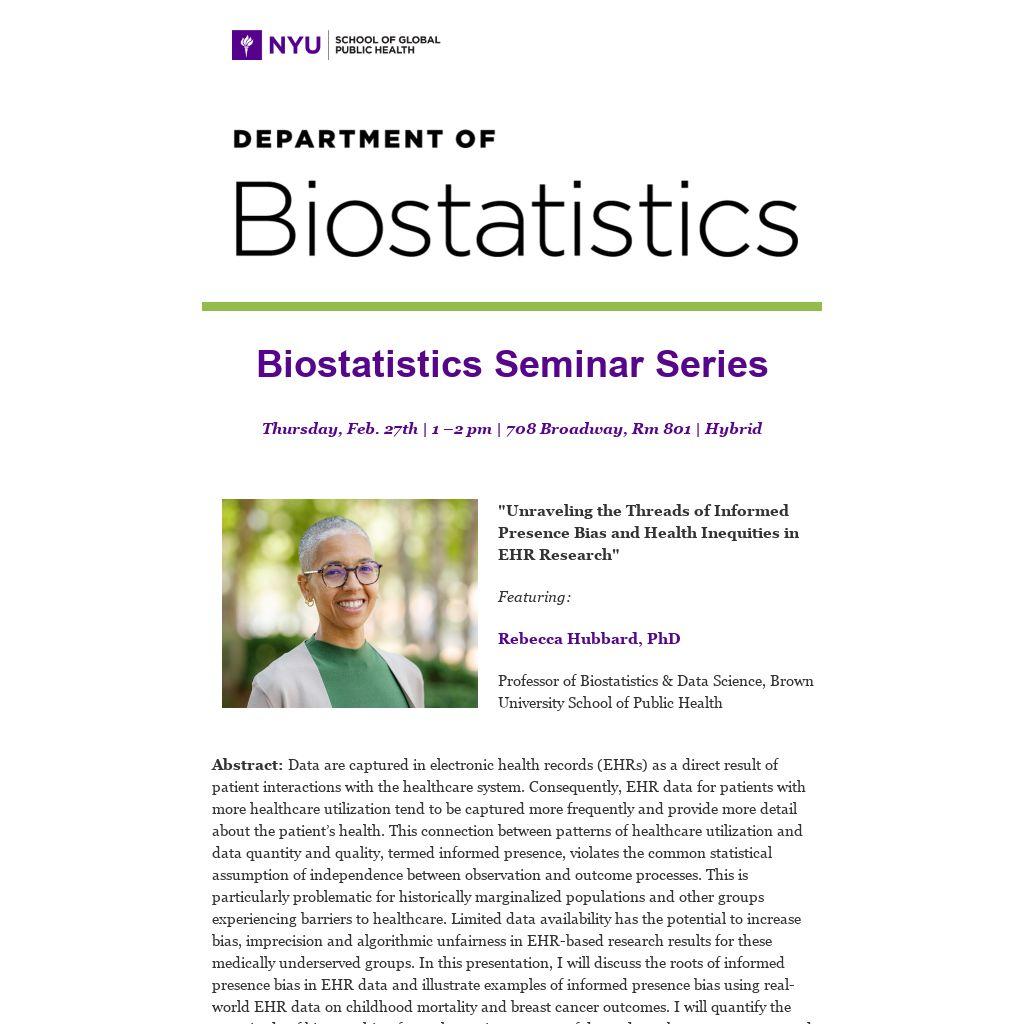 Abstract: Data are captured in electronic health records (EHRs) as a direct result of patient interactions with the healthcare system. Consequently, EHR data for patients with more healthcare utilization tend to be captured more frequently and provide more detail about the patient’s health. This connection between patterns of healthcare utilization and data quantity and quality, termed informed presence, violates the common statistical assumption of independence between observation and outcome processes. This is particularly problematic for historically marginalized populations and other groups experiencing barriers to healthcare. Limited data availability has the potential to increase bias, imprecision and algorithmic unfairness in EHR-based research results for these medically underserved groups. In this presentation, I will discuss the roots of informed presence bias in EHR data and illustrate examples of informed presence bias using real-world EHR data on childhood mortality and breast cancer outcomes. I will quantify the magnitude of bias resulting from alternative patterns of dependence between outcome and exposure data capture and healthcare utilization intensity and demonstrate several solutions to this problem. While EHR data can be used to accelerate precision medicine, achieving this goal while also safeguarding equity for underserved populations requires careful attention to data provenance and analytic methods.