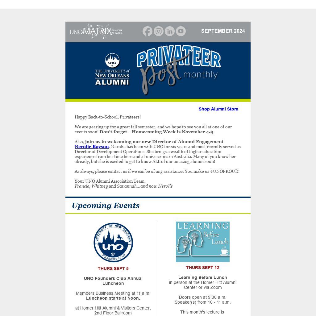 Also, join us in welcoming our new Director of Alumni Engagement Nerolie Rayson. Nerolie has been with UNO for six years and most recently served as Director of Development Operations. She brings a wealth of higher education experience from her time here and at universities in Australia. Many of you know her already, but she is excited to get to know ALL of our amazing alumni soon!