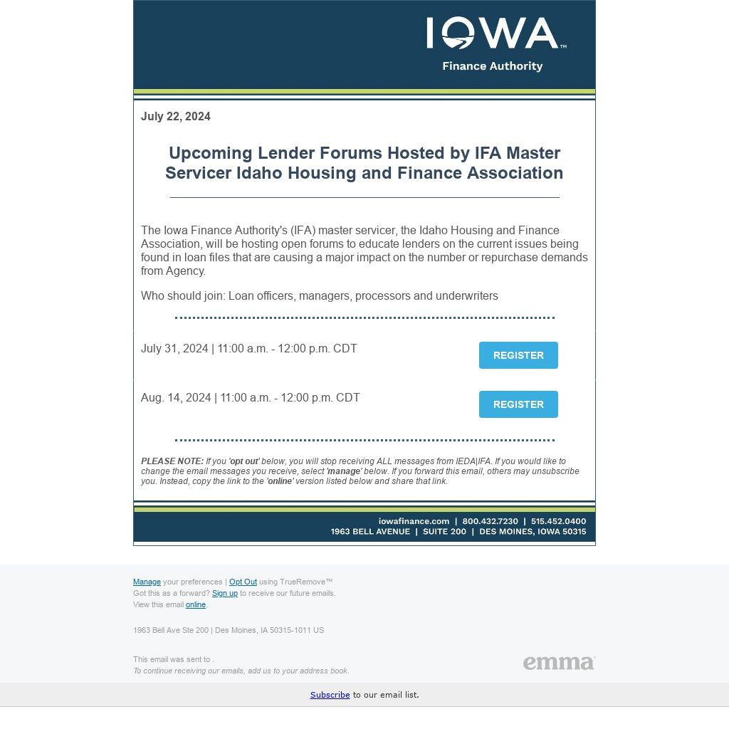 The Iowa Finance Authority's (IFA) master servicer, the Idaho Housing and Finance Association, will be hosting open forums to educate lenders on the current issues being found in loan files that are causing a major impact on the number or repurchase demands from Agency.