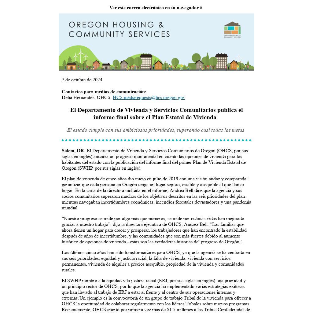 Salem, OR- El Departamento de Vivienda y Servicios Comunitarios de Oregon (OHCS, por sus siglas en inglés) anuncia un progreso monumental en cuanto las opciones de vivienda para los habitantes del estado con la publicación del informe final del primer Plan de Vivienda Estatal de Oregon (SWHP, por sus siglas en inglés).