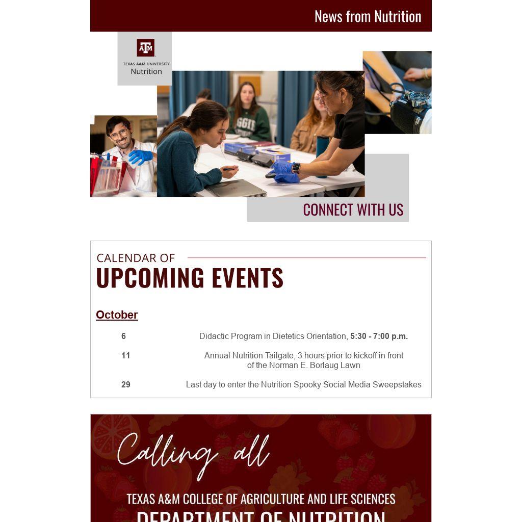 The Department of Nutrition at Texas A&M University is committed to providing students with an exceptional education that equips them with the knowledge, skills and expertise to excel as leaders in nutrition, health and food systems. Our students receive a comprehensive, science-driven education that prepares them for careers in health care, clinical nutrition, research, public health and more.