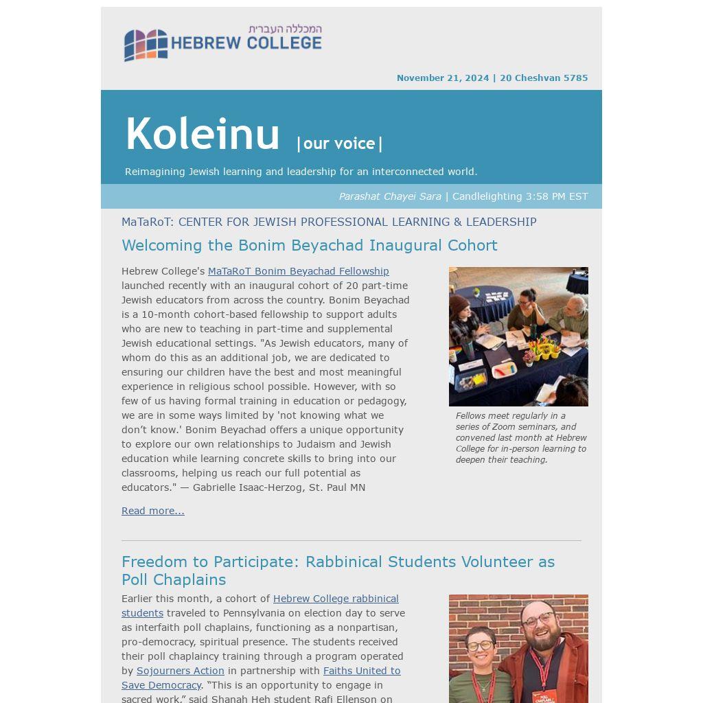 Earlier this month, a cohort of Hebrew College rabbinical students traveled to Pennsylvania on election day to serve as interfaith poll chaplains, functioning as a nonpartisan, pro-democracy, spiritual presence. The students received their poll chaplaincy training through a program operated by Sojourners Action in partnership with Faiths United to Save Democracy. “This is an opportunity to engage in sacred work,” said Shanah Heh student Rafi Ellenson on the eve of the trip. “We will help to ensure that voting is a fair and equitable process by applying the skills we are cultivating in the classroom/beit midrash.”