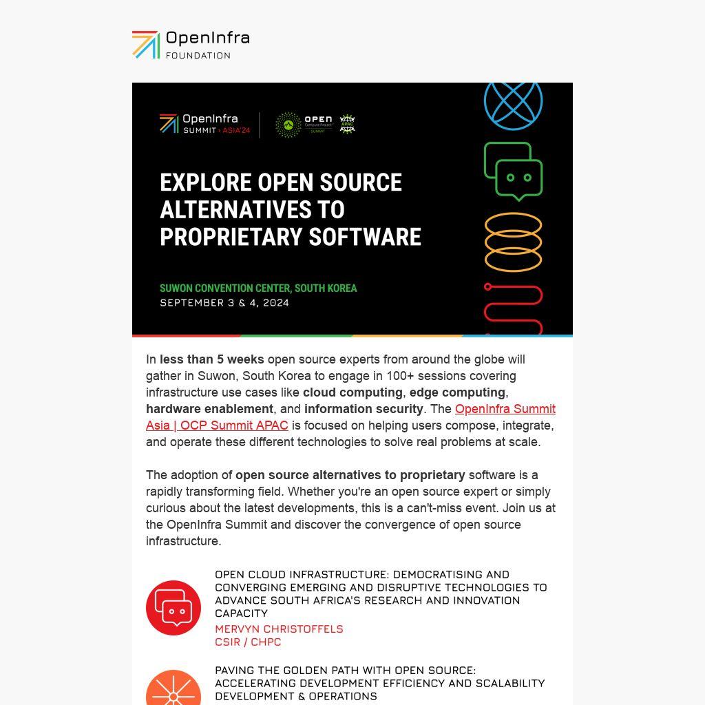 The adoption of open source alternatives to proprietary software is a rapidly transforming field. Whether you're an open source expert or simply curious about the latest developments, this is a can't-miss event. Join us at the OpenInfra Summit and discover the convergence of open source infrastructure.