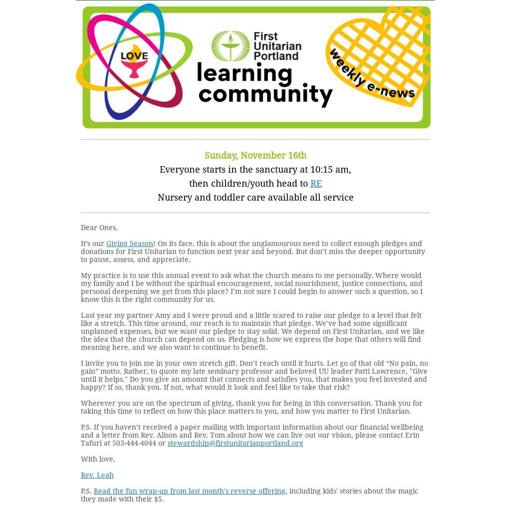 P.S. If you haven’t received a paper mailing with important information about our financial wellbeing and a letter from Rev. Alison and Rev. Tom about how we can live out our vision, please contact Erin Tafuri at 503-444-4044 or stewardship@firstunitarianportland.org