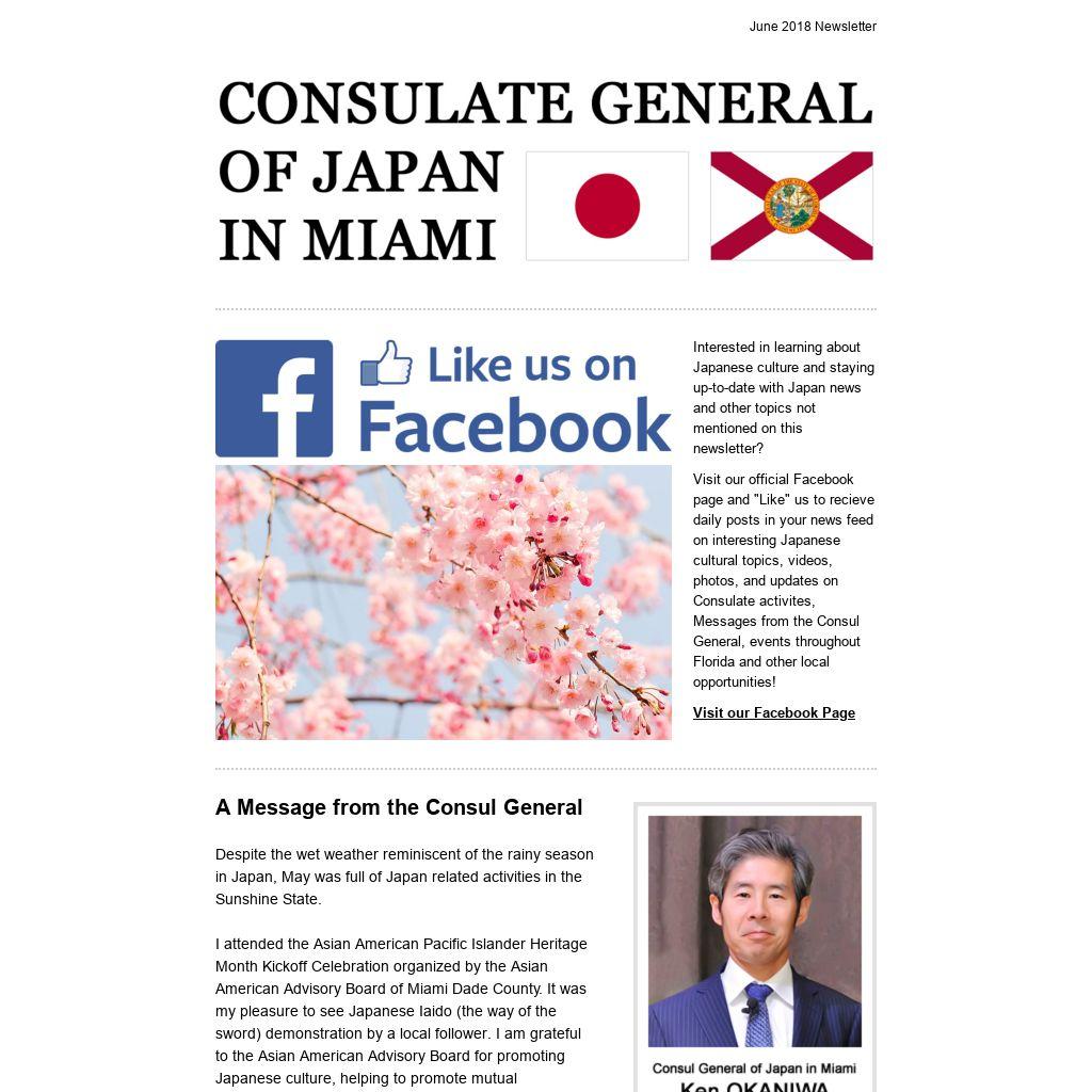 Interested in learning about Japanese culture and staying up-to-date with Japan news and other topics not mentioned on this newsletter? Visit our official Facebook page and "Like" us to recieve daily posts in your news feed on interesting Japanese cultural topics, videos, photos, and updates on Consulate activites, Messages from the Consul General, events throughout Florida and other local opportunities!