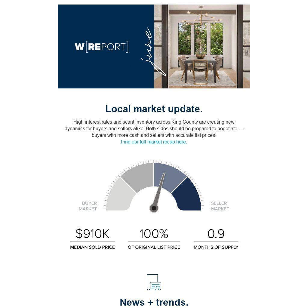 High interest rates and scant inventory across King County are creating new dynamics for buyers and sellers alike. Both sides should be prepared to negotiate — buyers with more cash and sellers with accurate list prices. Find our full market recap here.
