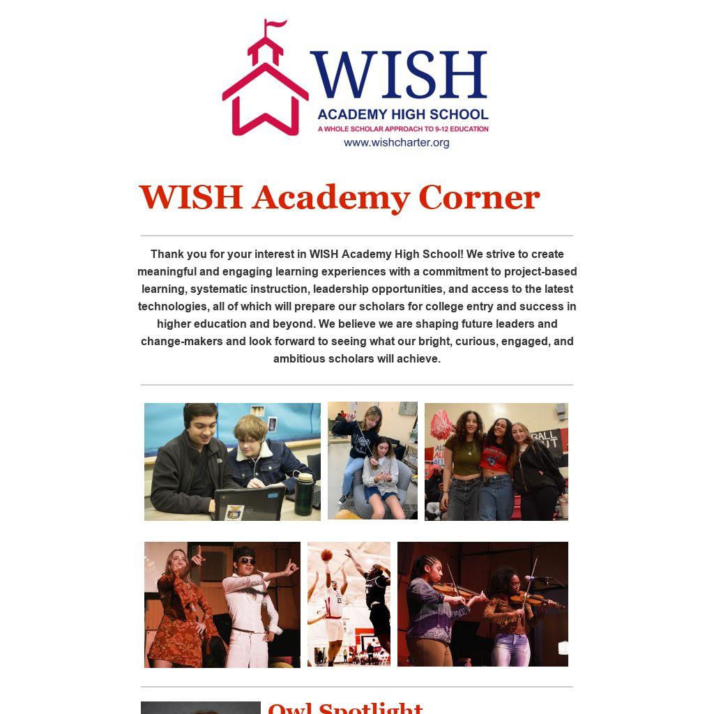 Thank you for your interest in WISH Academy High School! We strive to create meaningful and engaging learning experiences with a commitment to project-based learning, systematic instruction, leadership opportunities, and access to the latest technologies, all of which will prepare our scholars for college entry and success in higher education and beyond. We believe we are shaping future leaders and change-makers and look forward to seeing what our bright, curious, engaged, and ambitious scholars will achieve.