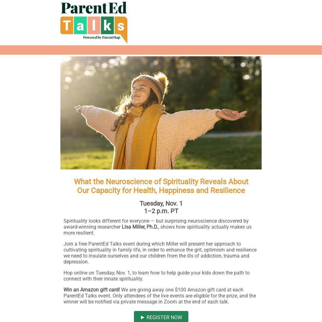 Win an Amazon gift card! We are giving away one $100 Amazon gift card at each ParentEd Talks event. Only attendees of the live events are eligible for the prize, and the winner will be notified via private message in Zoom at the end of each talk.