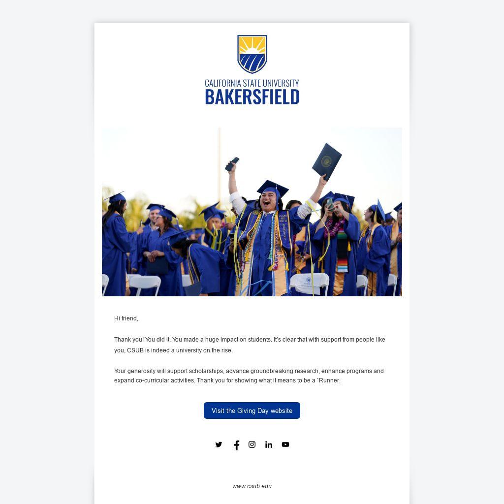 Thank you! You did it. You made a huge impact on students. It’s clear that with support from people like you, CSUB is indeed a university on the rise.