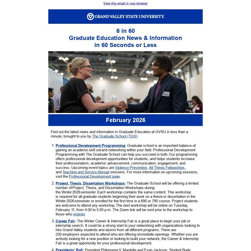 Project, Thesis, Dissertation Workshops: The Graduate School will be offering a limited number of Project, Thesis, and Dissertation Workshops during the Winter 2026 semester. Each workshop contains the same content. This workshop is required for all graduate students beginning their work on a thesis or dissertation in the Winter 2026 semester or enrolled for the first time in a 695 or 795 course. Project students are welcome to attend any workshop. The next workshop will be online on Tuesday, February 11, from 4:00 to 5:00 p.m. The Zoom link will be sent prior to the workshop to those who register.