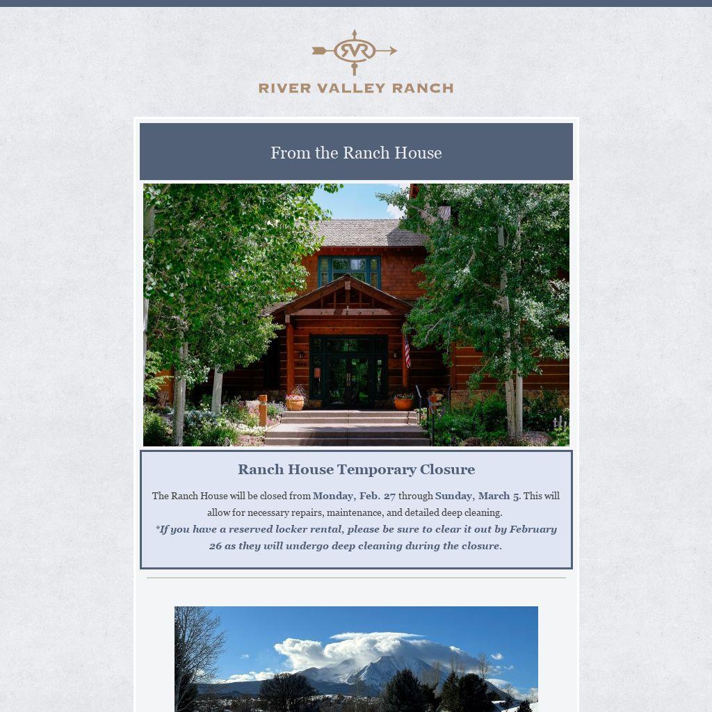 The Ranch House will be closed from Monday, Feb. 27 through Sunday, March 5. This will allow for necessary repairs, maintenance, and detailed deep cleaning. *If you have a reserved locker rental, please be sure to clear it out by February 26 as they will undergo deep cleaning during the closure.