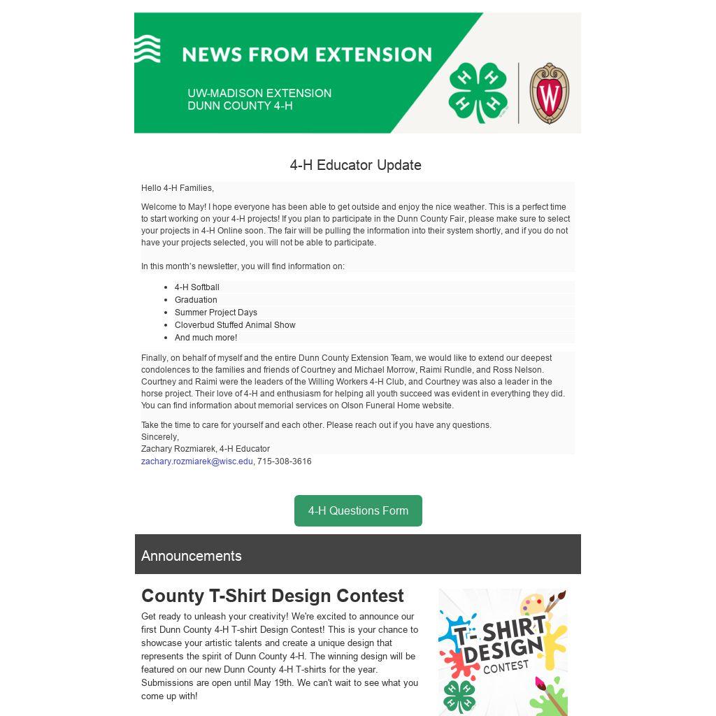 Welcome to May! I hope everyone has been able to get outside and enjoy the nice weather. This is a perfect time to start working on your 4-H projects! If you plan to participate in the Dunn County Fair, please make sure to select your projects in 4-H Online soon. The fair will be pulling the information into their system shortly, and if you do not have your projects selected, you will not be able to participate.