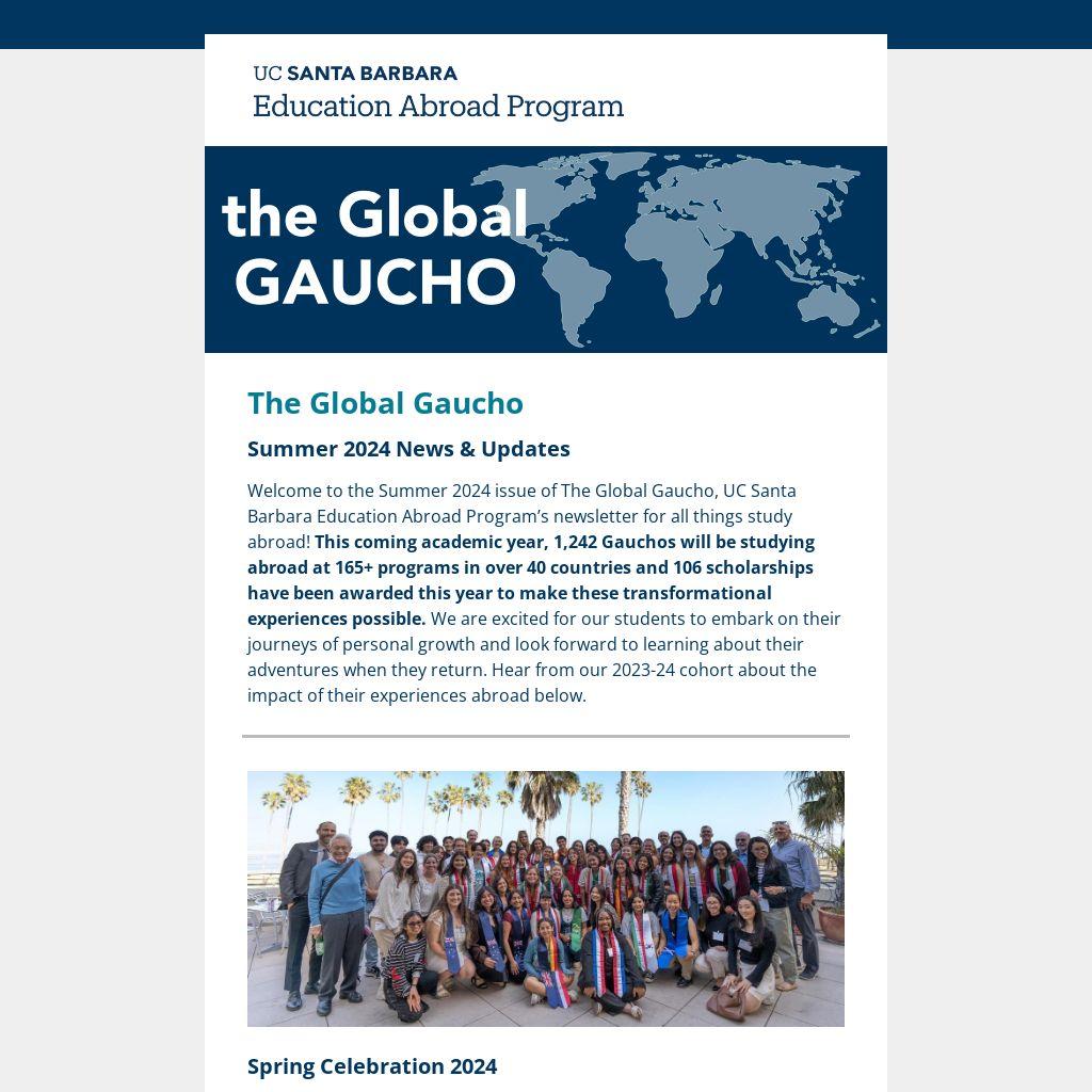 Welcome to the Summer 2024 issue of The Global Gaucho, UC Santa Barbara Education Abroad Program’s newsletter for all things study abroad! This coming academic year, 1,242 Gauchos will be studying abroad at 165+ programs in over 40 countries and 106 scholarships have been awarded this year to make these transformational experiences possible. We are excited for our students to embark on their journeys of personal growth and look forward to learning about their adventures when they return. Hear from our 2023-24 cohort about the impact of their experiences abroad below.