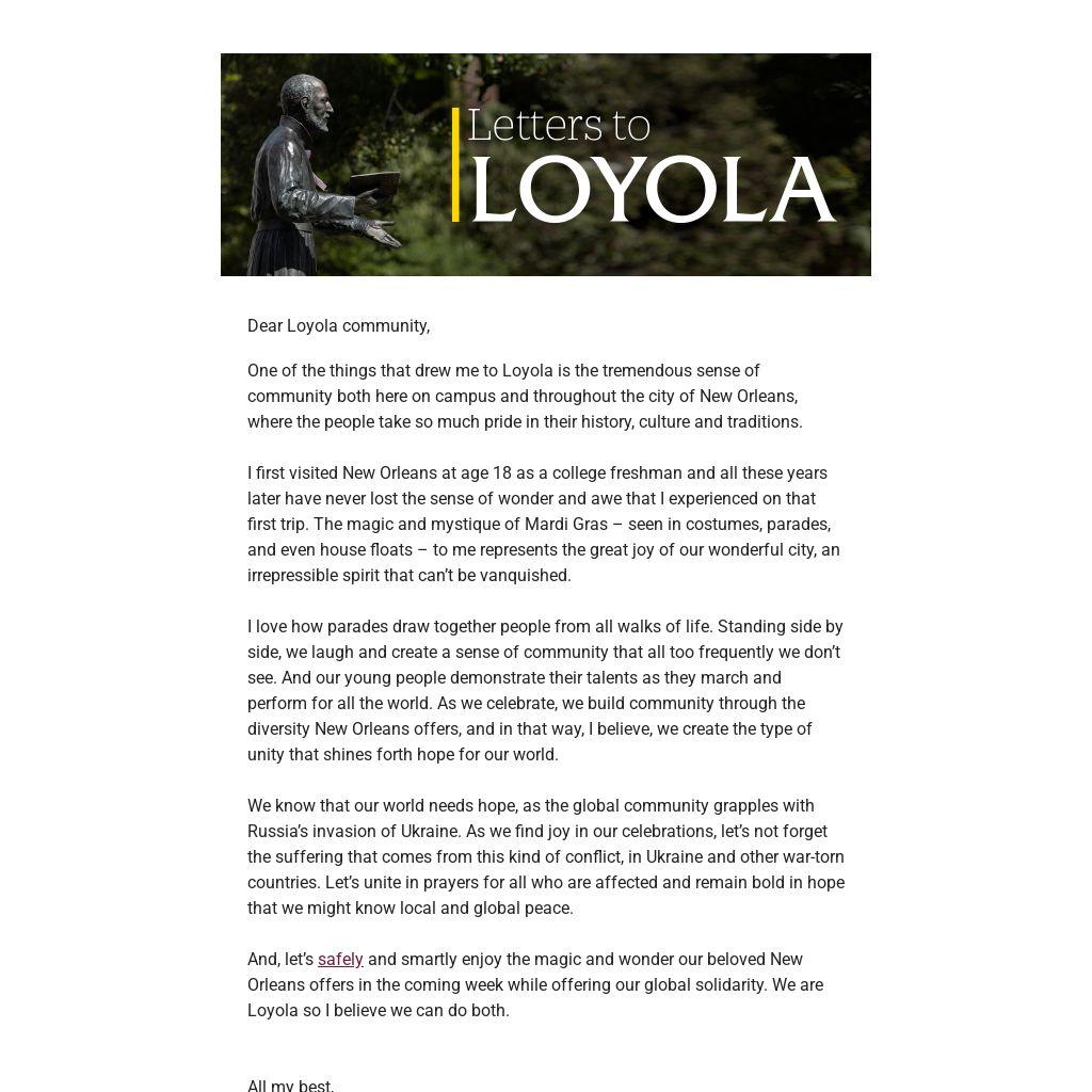 And, let’s safely and smartly enjoy the magic and wonder our beloved New Orleans offers in the coming week while offering our global solidarity. We are Loyola so I believe we can do both.