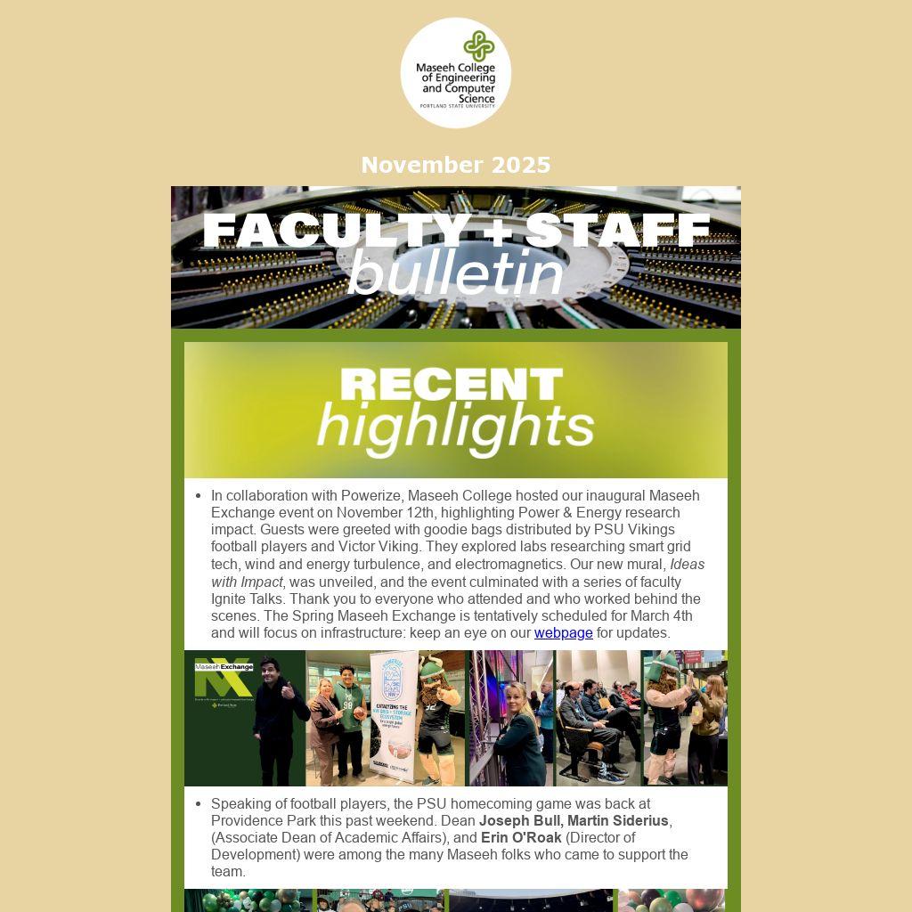 In collaboration with Powerize, Maseeh College hosted our inaugural Maseeh Exchange event on November 12th, highlighting Power & Energy research impact. Guests were greeted with goodie bags distributed by PSU Vikings football players and Victor Viking. They explored labs researching smart grid tech, wind and energy turbulence, and electromagnetics. Our new mural, Ideas with Impact, was unveiled, and the event culminated with a series of faculty Ignite Talks. Thank you to everyone who attended and who worked behind the scenes. The Spring Maseeh Exchange is tentatively scheduled for March 4th and will focus on infrastructure: keep an eye on our webpage for updates.