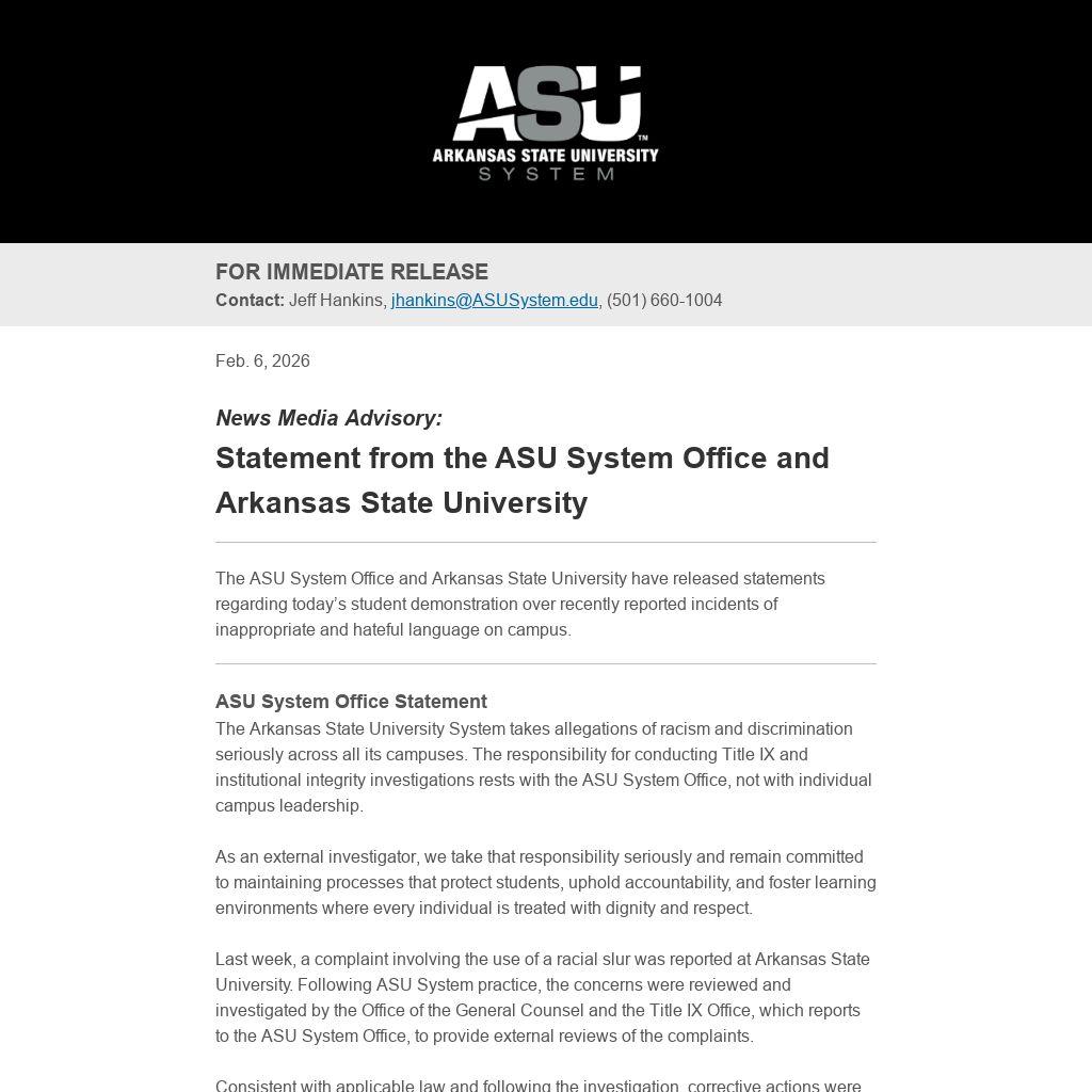 The Arkansas State University System takes allegations of racism and discrimination seriously across all its campuses. The responsibility for conducting Title IX and institutional integrity investigations rests with the ASU System Office, not with individual campus leadership.