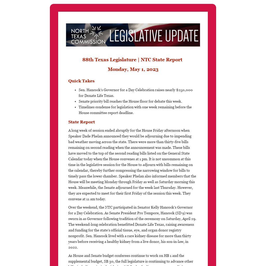 - Sen. Hancock’s Governor for a Day Celebration raises nearly $250,000 for Donate Life Texas.