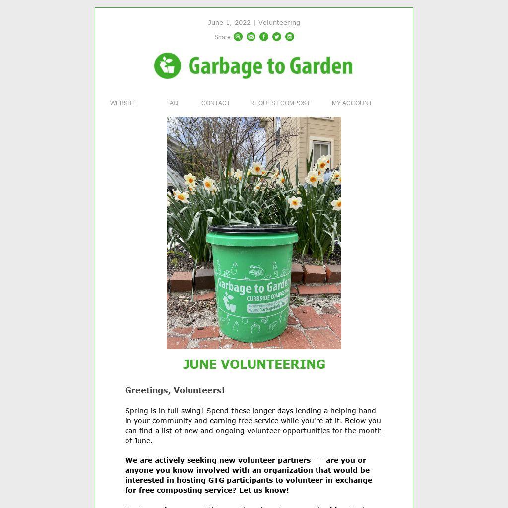 To sign up for an event this month and receive a month of free Garbage to Garden service, RSVP by email and we will help answer any questions you may have. Then simply send confirmation of your volunteer hours to volunteer@garbagetogarden.org to receive credit. Remember, events are first-come, first-serve.