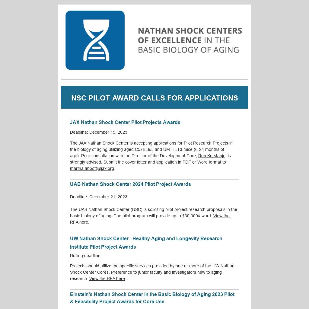 The UAB Nathan Shock Center (NSC) is soliciting pilot project research proposals in the basic biology of aging. The pilot program will provide up to $30,000/award. View the RFA here.