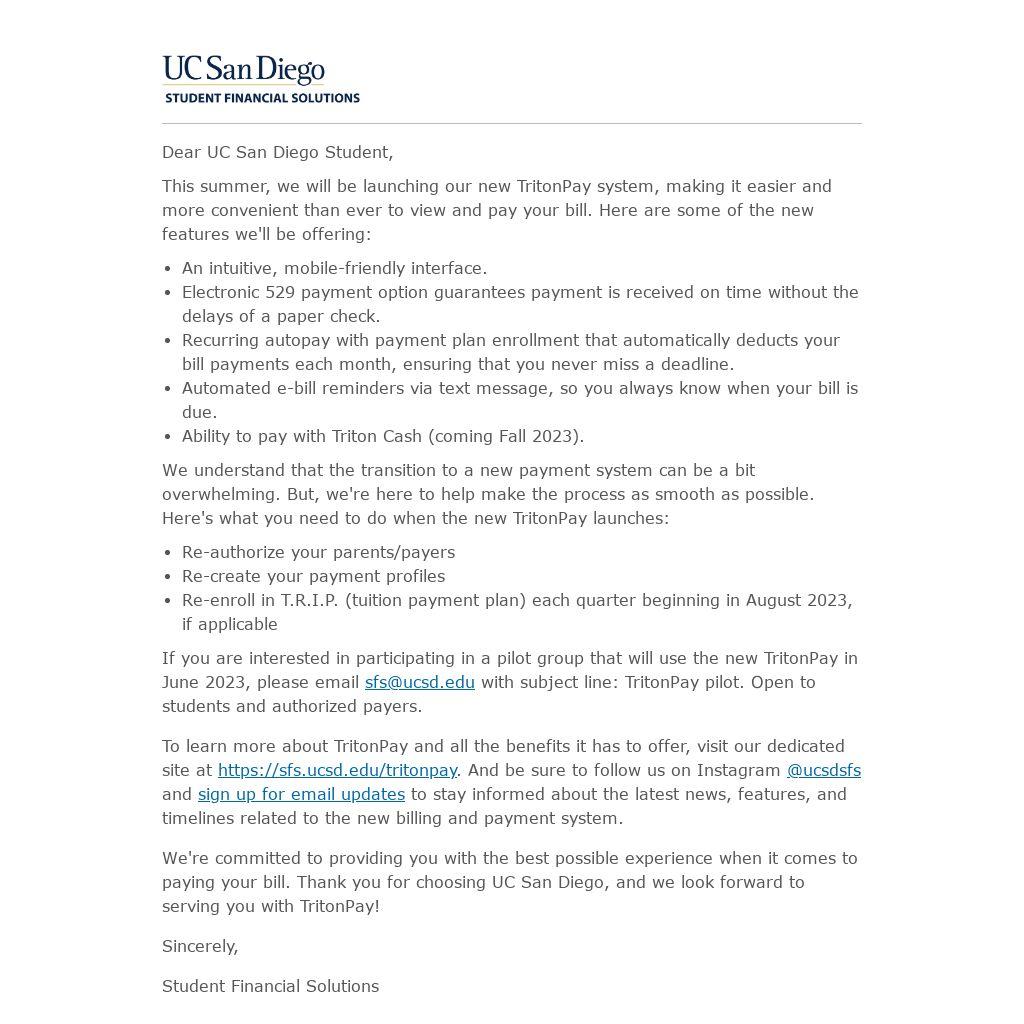 We're committed to providing you with the best possible experience when it comes to paying your bill. Thank you for choosing UC San Diego, and we look forward to serving you with TritonPay!