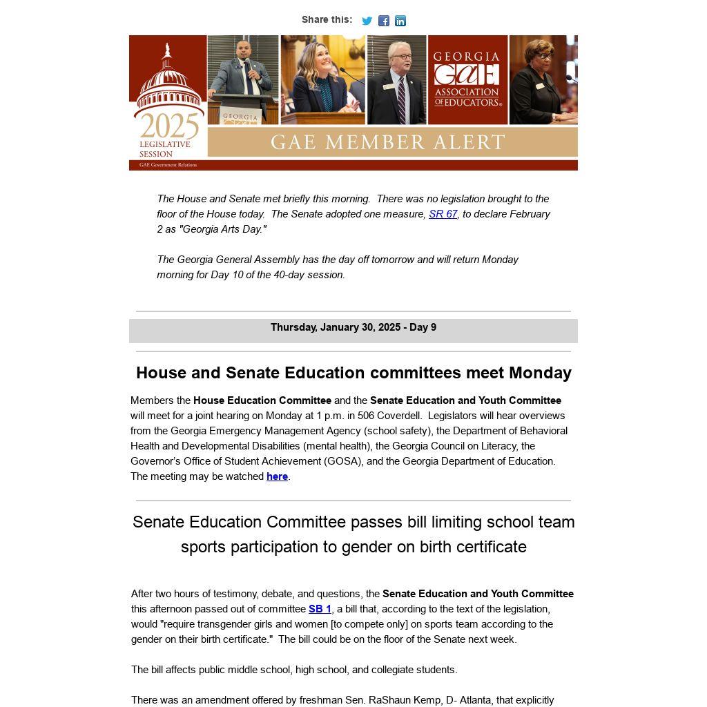 The House and Senate met briefly this morning. There was no legislation brought to the floor of the House today. The Senate adopted one measure, SR 67, to declare February 2 as "Georgia Arts Day."