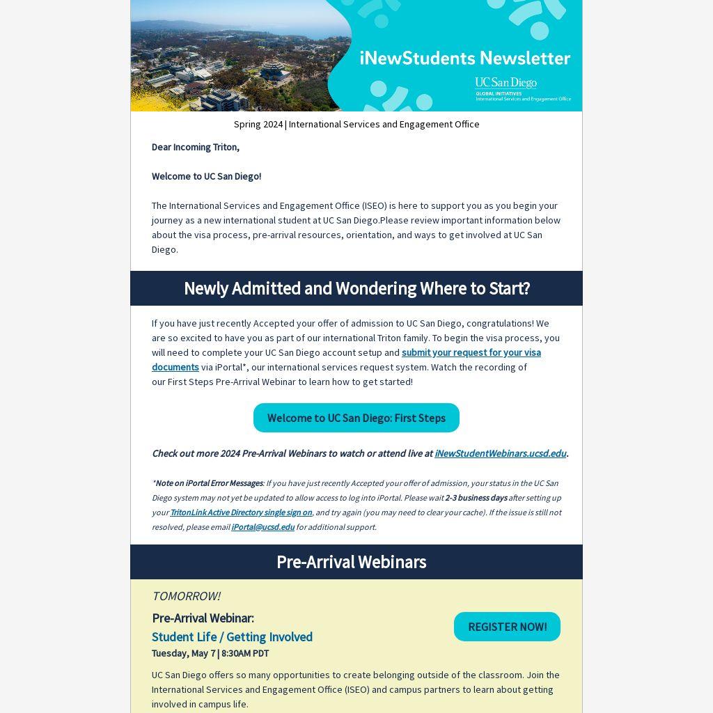 If you have just recently Accepted your offer of admission to UC San Diego, congratulations! We are so excited to have you as part of our international Triton family. To begin the visa process, you will need to complete your UC San Diego account setup and submit your request for your visa documents via iPortal*, our international services request system. Watch the recording of our First Steps Pre-Arrival Webinar to learn how to get started!