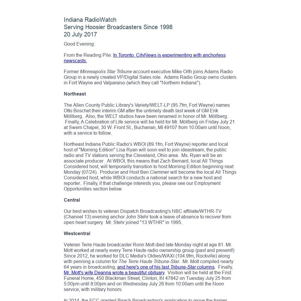 Indiana RadioWatch subscriptions are free. To subscribe, send an e-mail to irw@well.com and we'll add you. After publication, we archive Indiana RadioWatch on the Indiana Radio Archive at http://www.indianaradio.net. Please e-mail us your news stories and employment opportunities.