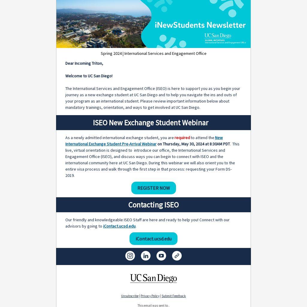 As a newly admitted international exchange student, you are required to attend the New International Exchange Student Pre-Arrival Webinar on Thursday, May 30, 2024 at 8:30AM PDT. This live, virtual orientation is designed to introduce our office, the International Services and Engagement Office (ISEO), and discuss ways you can begin to connect with ISEO and the international community here at UC San Diego. During this webinar we will also orient you to the entire visa process and walk through the first step in that process: requesting your Form DS-2019.