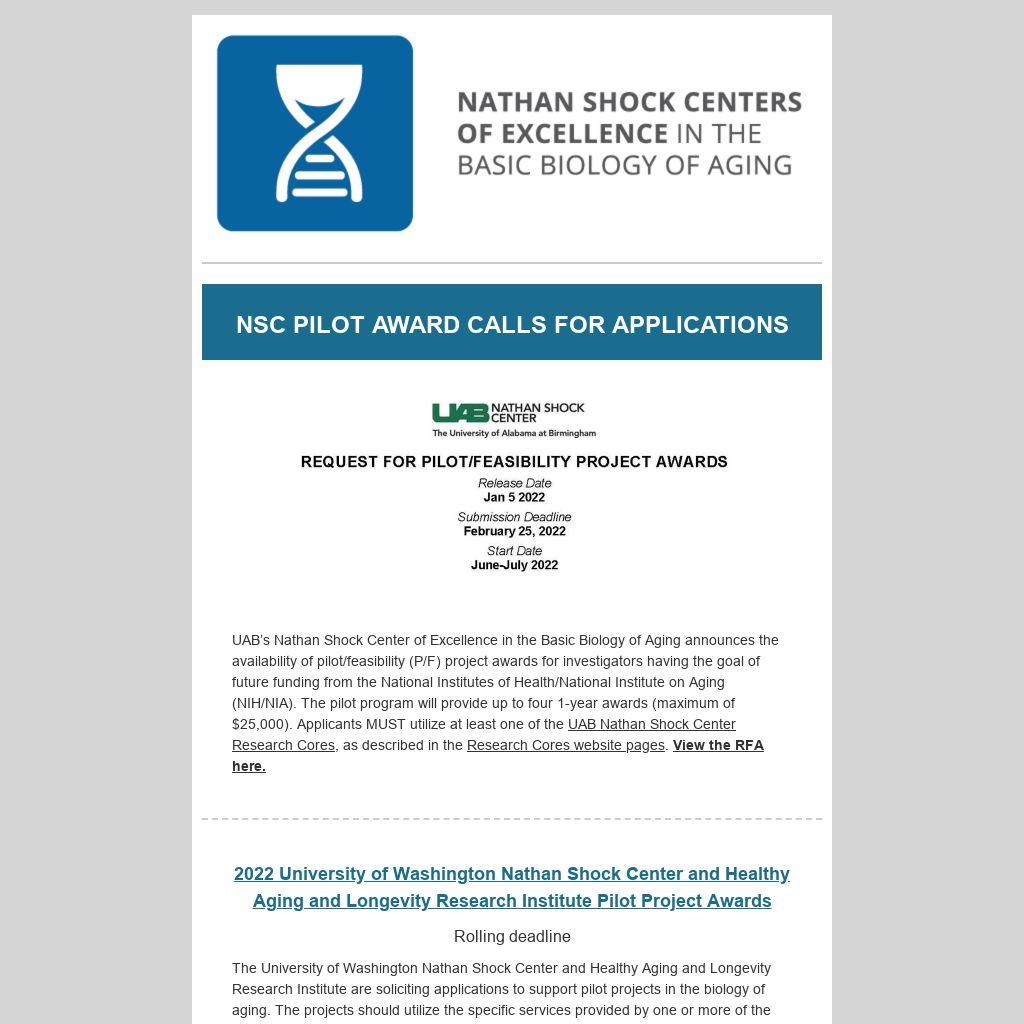 The University of Washington Nathan Shock Center and Healthy Aging and Longevity Research Institute are soliciting applications to support pilot projects in the biology of aging. The projects should utilize the specific services provided by one or more of the UW Nathan Shock Center Cores. The awards are generally up to $10,000, depending on the specific needs of the applicant. View the RFA here.