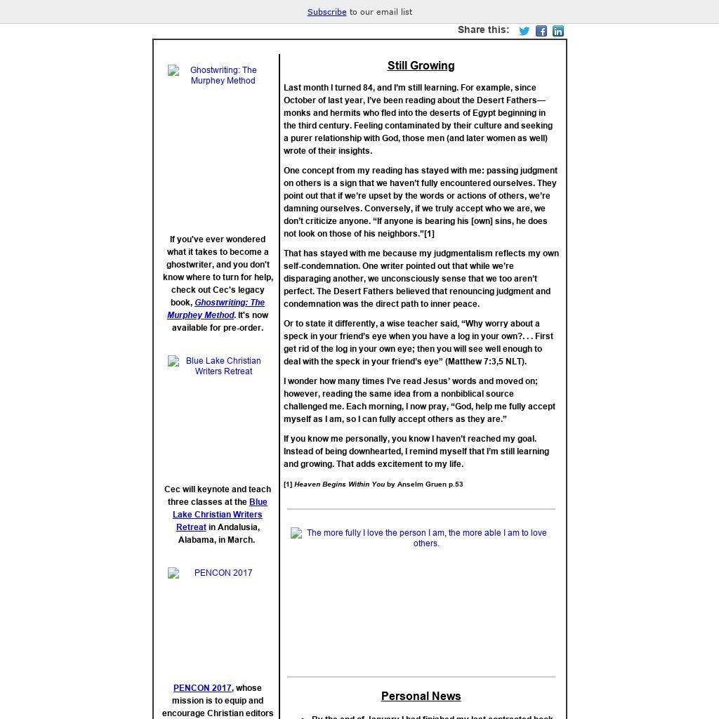 | PENCON 2017, whose mission is to equip and encourage Christian editors in cooperative competition through networking, will take place in Atlanta, May 4-6. Cec will keynote and teach two classes.