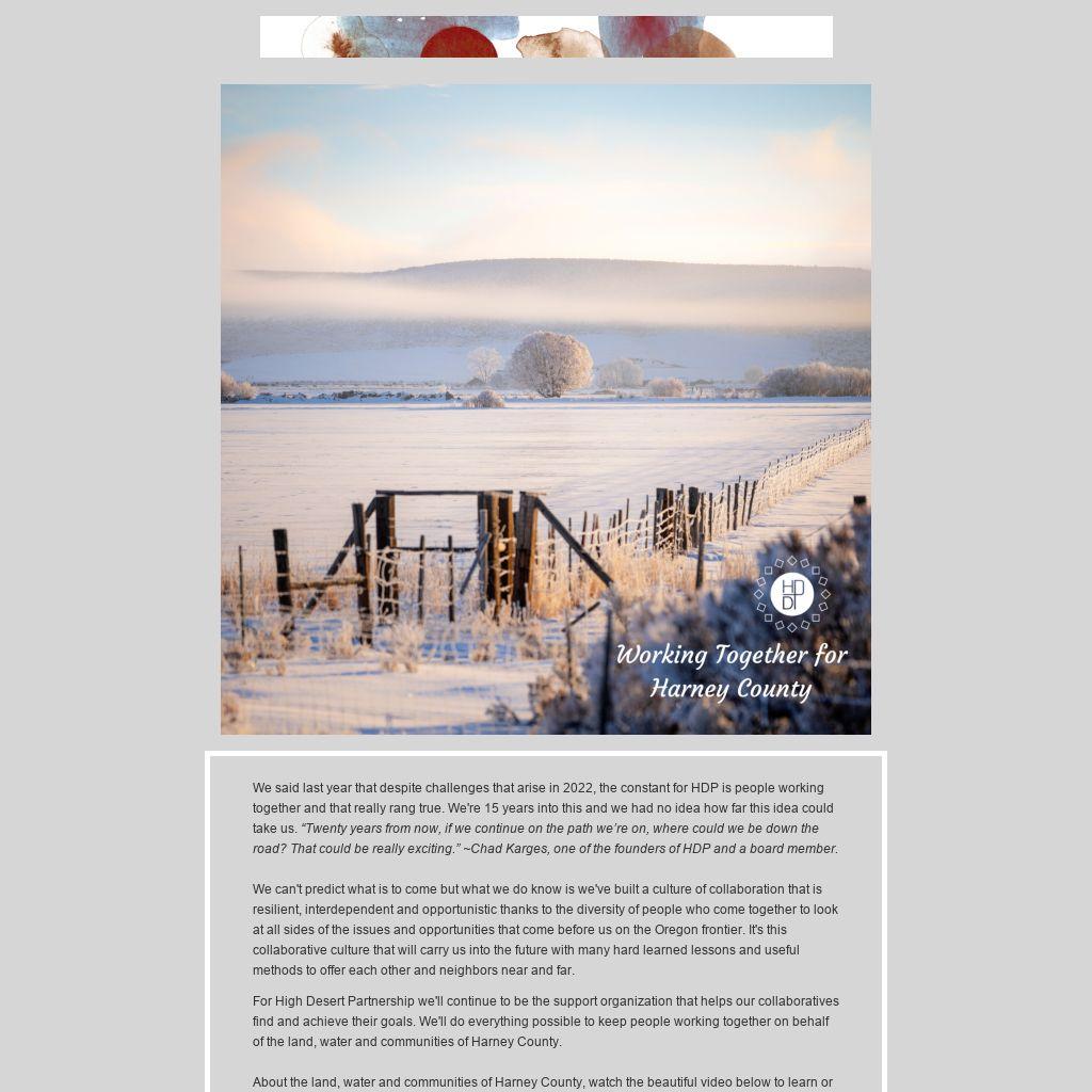 For High Desert Partnership we'll continue to be the support organization that helps our collaboratives find and achieve their goals. We'll do everything possible to keep people working together on behalf of the land, water and communities of Harney County.