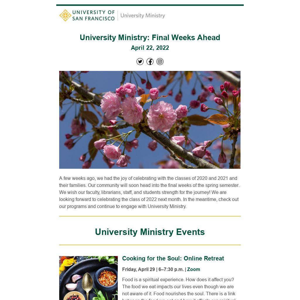A few weeks ago, we had the joy of celebrating with the classes of 2020 and 2021 and their families. Our community will soon head into the final weeks of the spring semester. We wish our faculty, librarians, staff, and students strength for the journey! We are looking forward to celebrating the class of 2022 next month. In the meantime, check out our programs and continue to engage with University Ministry.