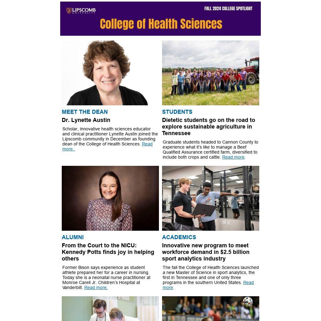 In addition, the Lipscomb Student Nurses Association, the Nursing Christian Fellowship, the Pre-Physicians Assistant Club and the Kinesiology Club meet regularly throughout the semester. The School of Nursing also hosts a breakout chapel that meets every Wednesday to study scripture with an emphasis on application for nurses.