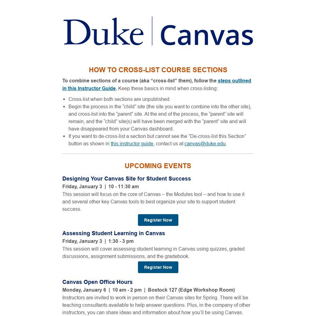 If you want to de-cross-list a section but cannot see the “De-cross-list this Section” button as shown in this instructor guide, contact us at canvas@duke.edu.