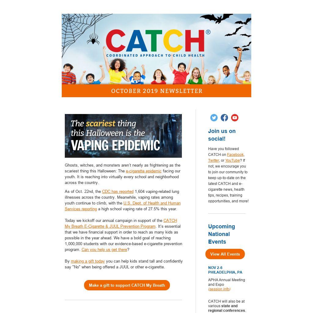 Have you followed CATCH on Facebook, Twitter, or YouTube? If not, we encourage you to join our community to keep up-to-date on the latest CATCH and e-cigarette news, health tips, recipes, training opportunities, and more!