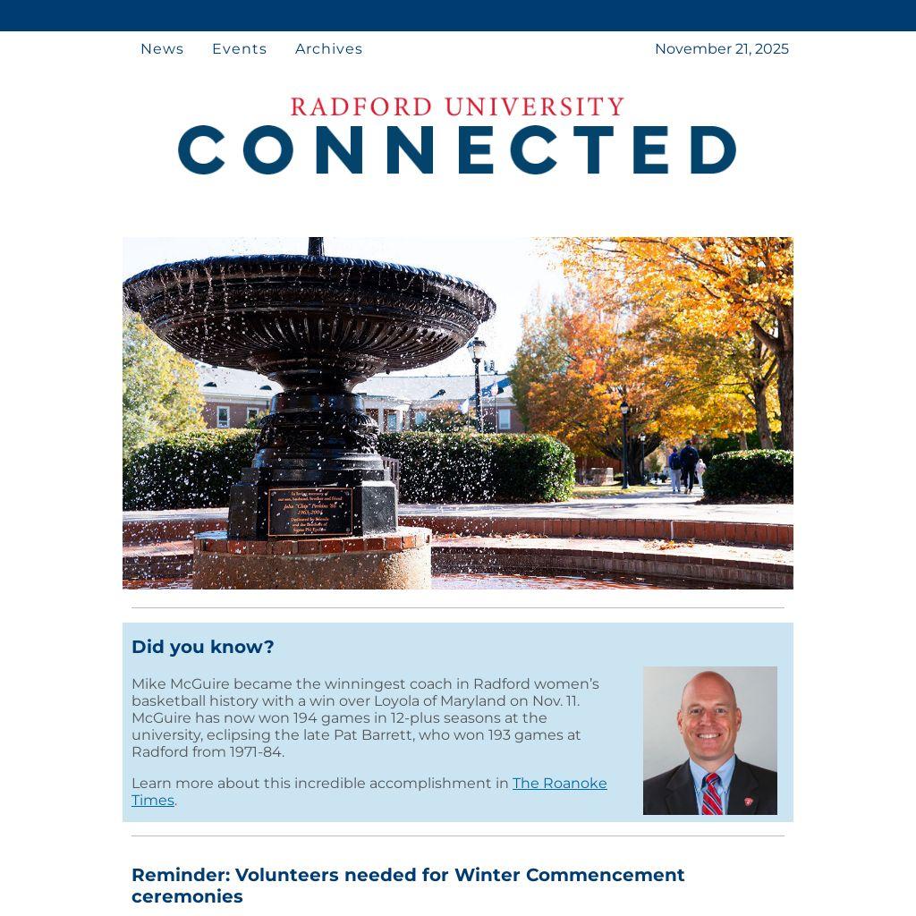With Radford University’s Winter Commencement ceremonies coming up on Friday, Dec. 12 and Saturday, Dec. 13, volunteers are still needed to assist graduating students and their families. Please consider volunteering for one or more of the ceremonies. Employees interested in volunteering for Winter Commencement should complete the 2025 Winter Commencement volunteer form by Monday, Dec. 1.