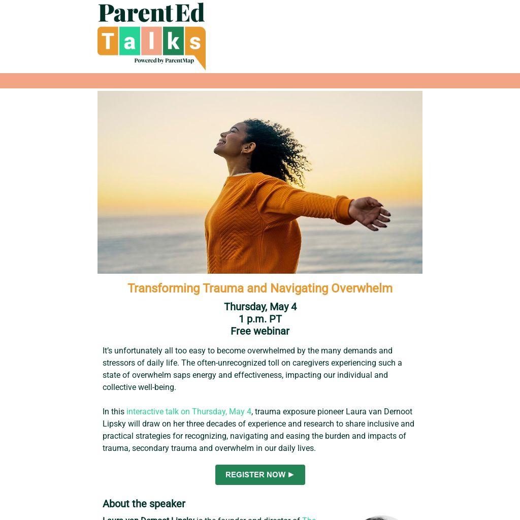 In this interactive talk on Thursday, May 4, trauma exposure pioneer Laura van Dernoot Lipsky will draw on her three decades of experience and research to share inclusive and practical strategies for recognizing, navigating and easing the burden and impacts of trauma, secondary trauma and overwhelm in our daily lives.