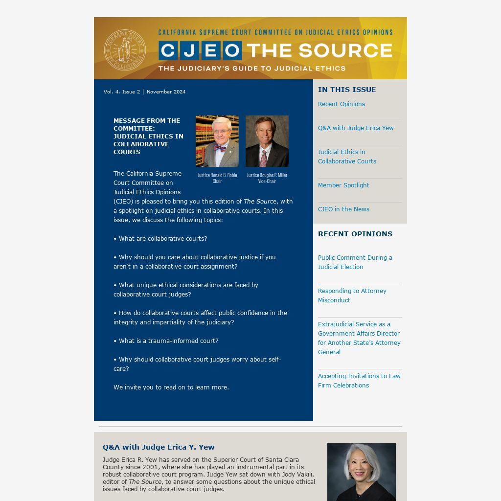 The California Supreme Court Committee on Judicial Ethics Opinions (CJEO) is pleased to bring you this edition of The Source, with a spotlight on judicial ethics in collaborative courts. In this issue, we discuss the following topics: