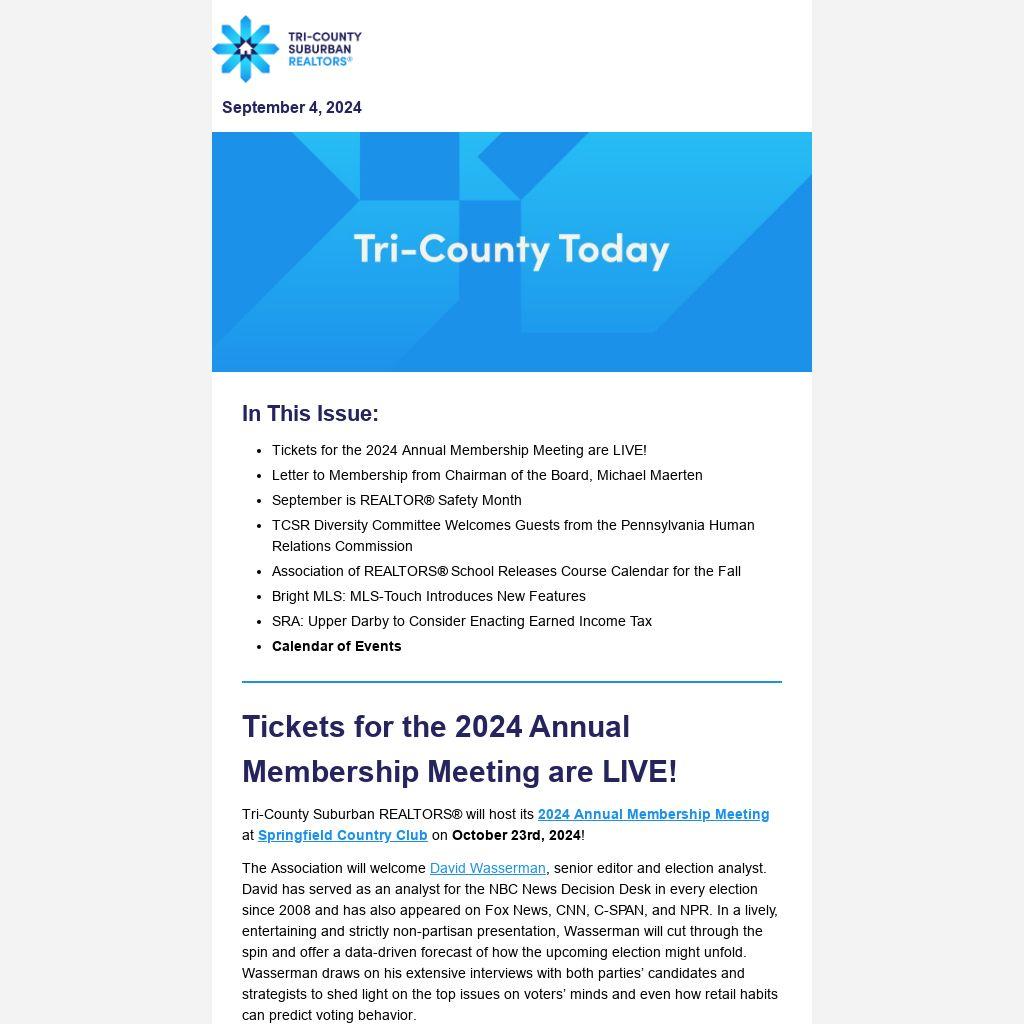 Tri-County Suburban REALTORS® will host its 2024 Annual Membership Meeting at Springfield Country Club on October 23rd, 2024!