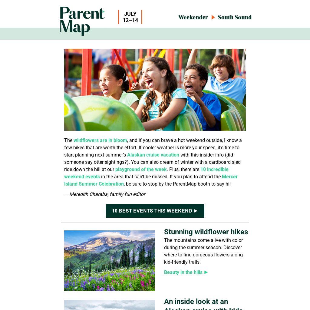 The wildflowers are in bloom, and if you can brave a hot weekend outside, I know a few hikes that are worth the effort. If cooler weather is more your speed, it’s time to start planning next summer’s Alaskan cruise vacation with this insider info (did someone say otter sightings?). You can also dream of winter with a cardboard sled ride down the hill at our playground of the week. Plus, there are 10 incredible weekend events in the area that can’t be missed. If you plan to attend the Mercer Island Summer Celebration, be sure to stop by the ParentMap booth to say hi!