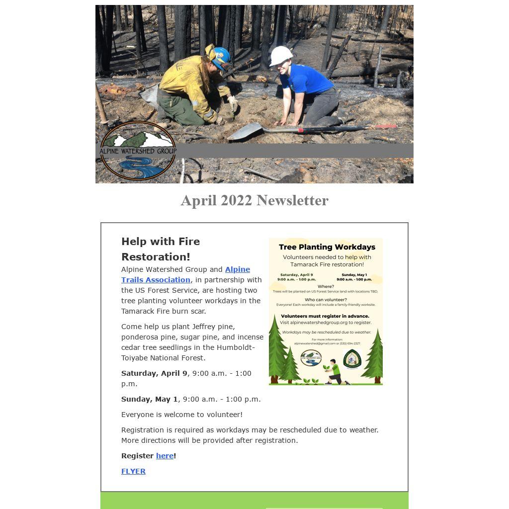 Alpine Watershed Group and Alpine Trails Association, in partnership with the US Forest Service, are hosting two tree planting volunteer workdays in the Tamarack Fire burn scar.