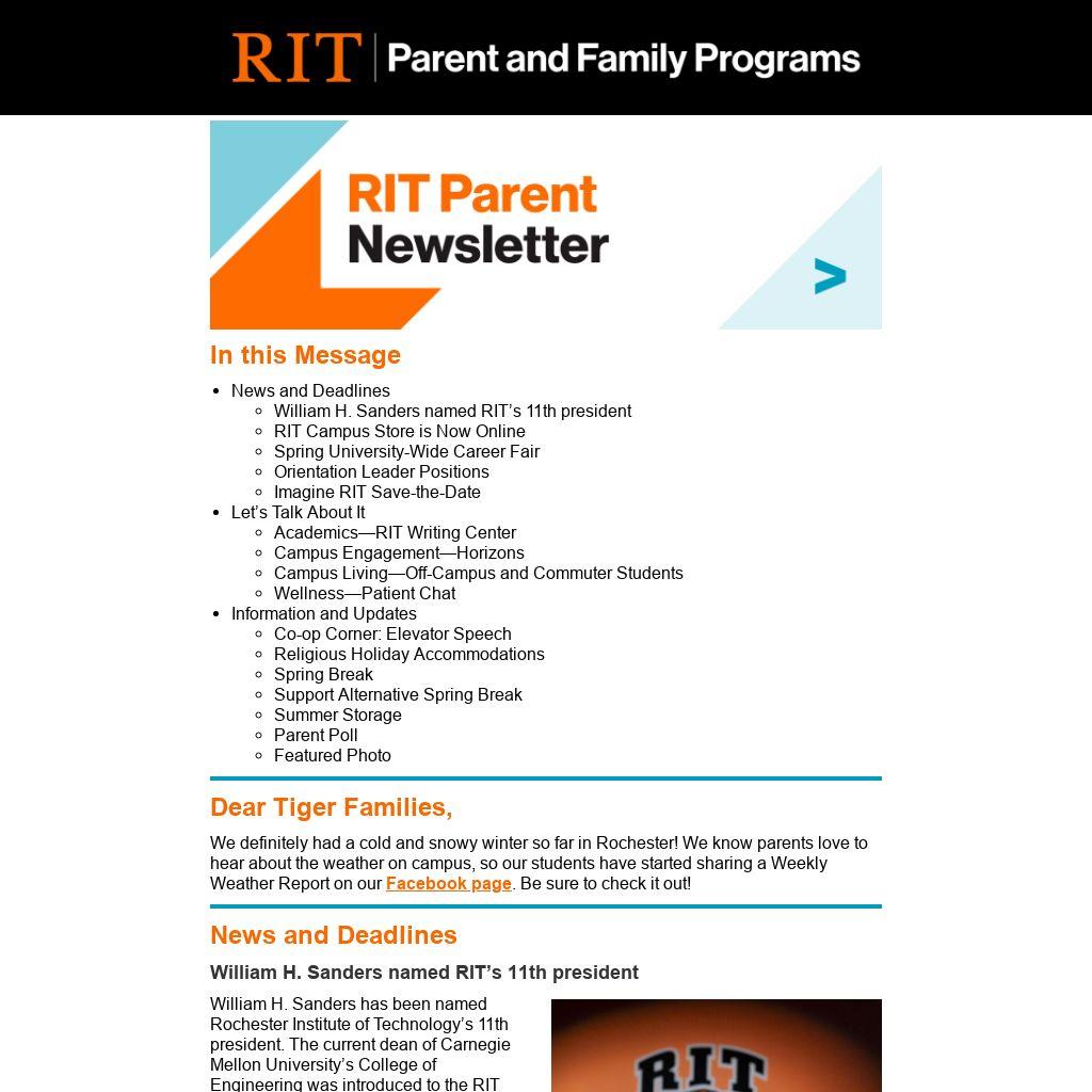 Spring Break is on March 9-16. If your student is traveling, please have a discussion within the next month about Spring Break safety and health. RIT Housing requests that students who are leaving their rooms/apartments for the week prepare by emptying trash cans and cleaning out fridges, locking windows and doors, and unplugging electronic equipment (fridges can remain plugged in). Dining hours and locations during the week can be found on the RIT Dining website.