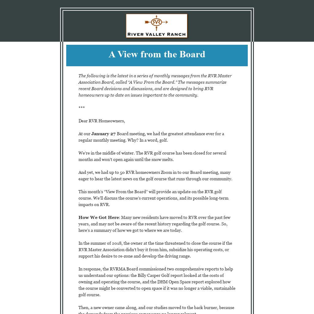 This month’s “View From the Board” will provide an update on the RVR golf course. We’ll discuss the course’s current operations, and its possible long-term impacts on RVR.