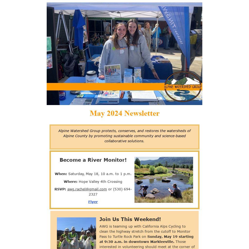 Join Us This Weekend!AWG is teaming up with California Alps Cycling to clean the highway stretch from the cutoff to Monitor Pass to Turtle Rock Park on Sunday, May 19 starting at 9:30 a.m. in downtown Markleeville. Those interested in volunteering should meet at the corner of Montgomery and Main Street, wear sun protection, and bring a water bottle. Gloves, hard hats, high visibility vests, trash bags, recycling bags, and trash grabbers will be provided. If you have questions about AWG's Adopt-A-Highway project, contact AWG at alpinewatershed@gmail.com.
