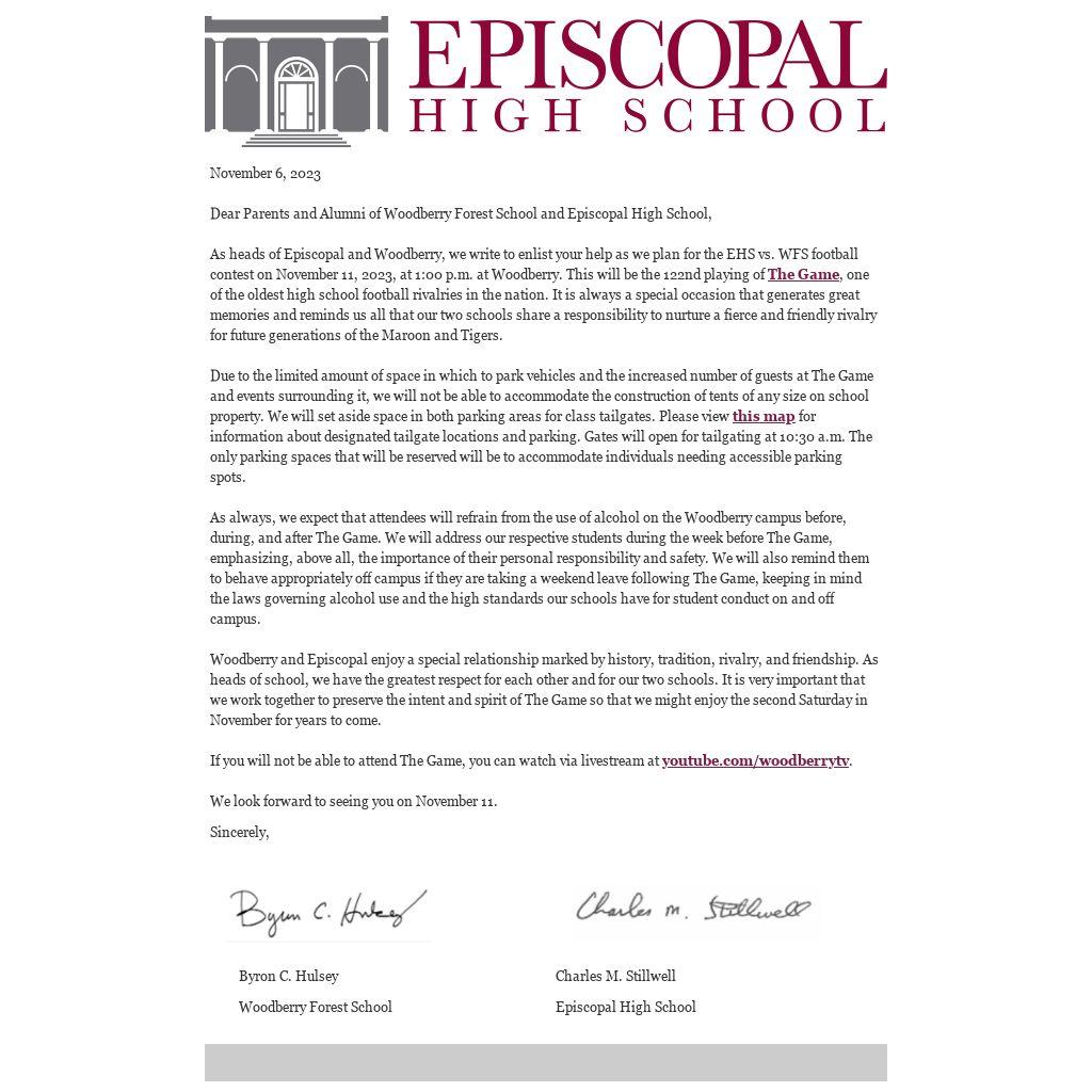As heads of Episcopal and Woodberry, we write to enlist your help as we plan for the EHS vs. WFS football contest on November 11, 2023, at 1:00 p.m. at Woodberry. This will be the 122nd playing of The Game, one of the oldest high school football rivalries in the nation. It is always a special occasion that generates great memories and reminds us all that our two schools share a responsibility to nurture a fierce and friendly rivalry for future generations of the Maroon and Tigers.