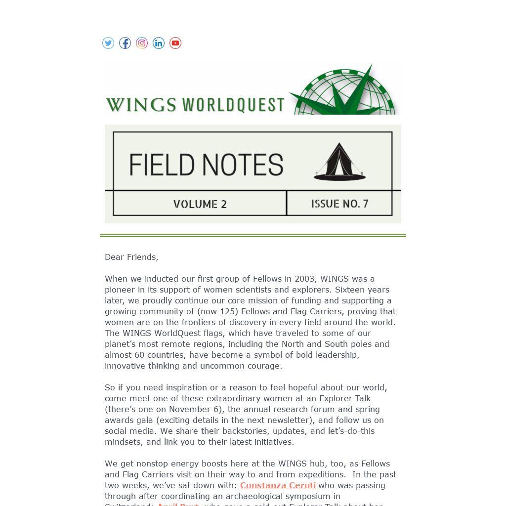 When we inducted our first group of Fellows in 2003, WINGS was a pioneer in its support of women scientists and explorers. Sixteen years later, we proudly continue our core mission of funding and supporting a growing community of (now 125) Fellows and Flag Carriers, proving that women are on the frontiers of discovery in every field around the world. The WINGS WorldQuest flags, which have traveled to some of our planet’s most remote regions, including the North and South poles and almost 60 countries, have become a symbol of bold leadership, innovative thinking and uncommon courage.